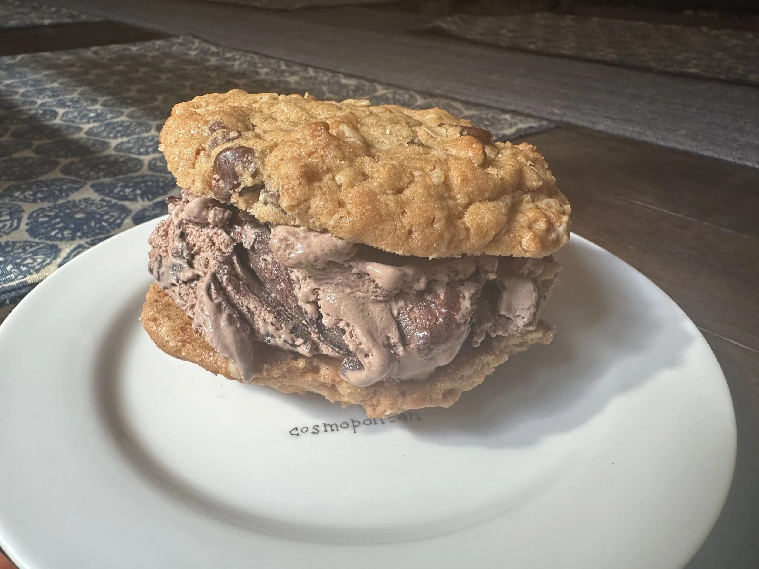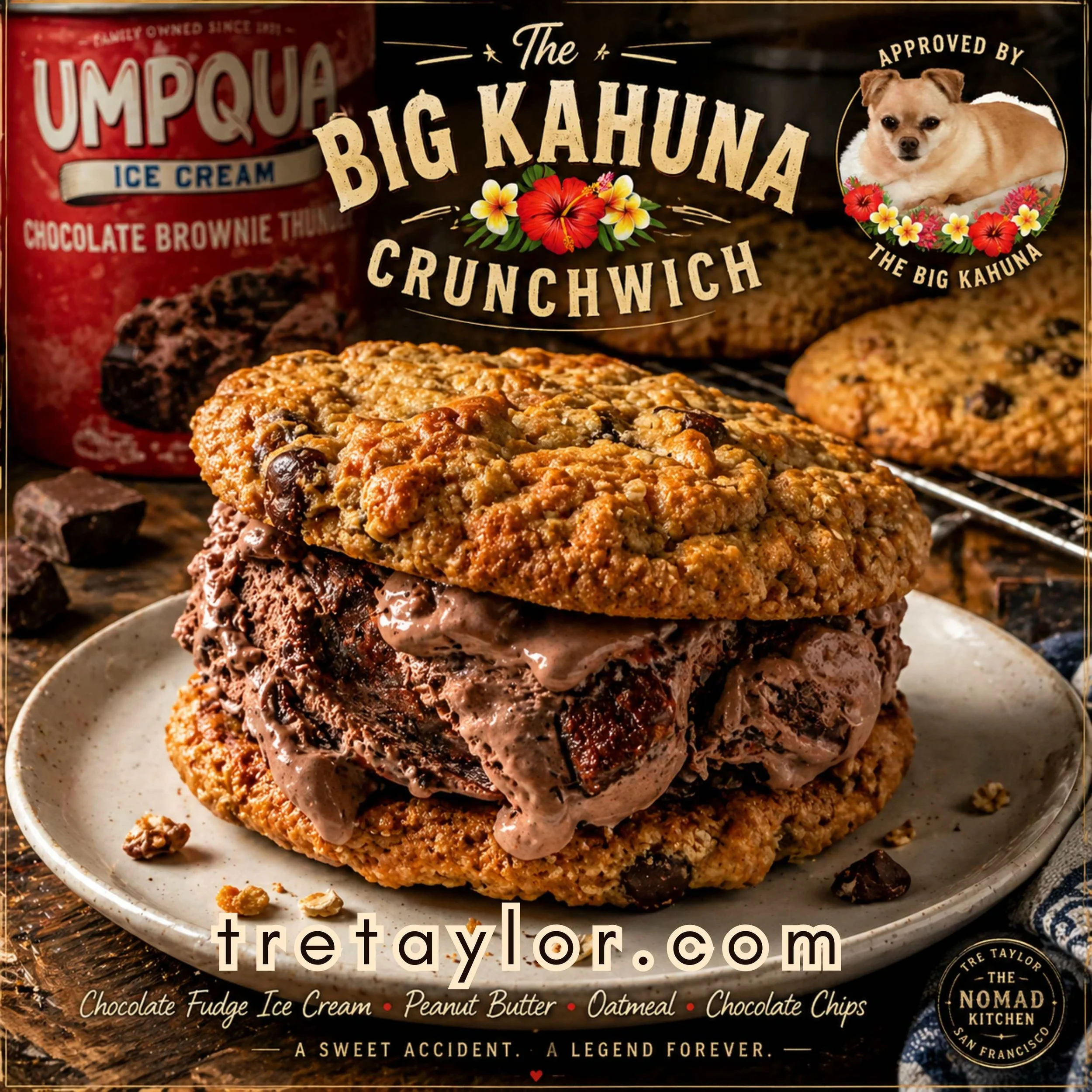 The Big Kahuna Crunchwich is a decadent homemade ice cream sandwich made with chocolate chip, peanut butter, and oatmeal cookies layered with rich chocolate fudge ice cream—born from a spontaneous Nomad Kitchen moment in San Francisco. Supervised by one very discerning (and very adorable) canine, this dessert was lovingly created as a welcome-home treat for traveling friends.
