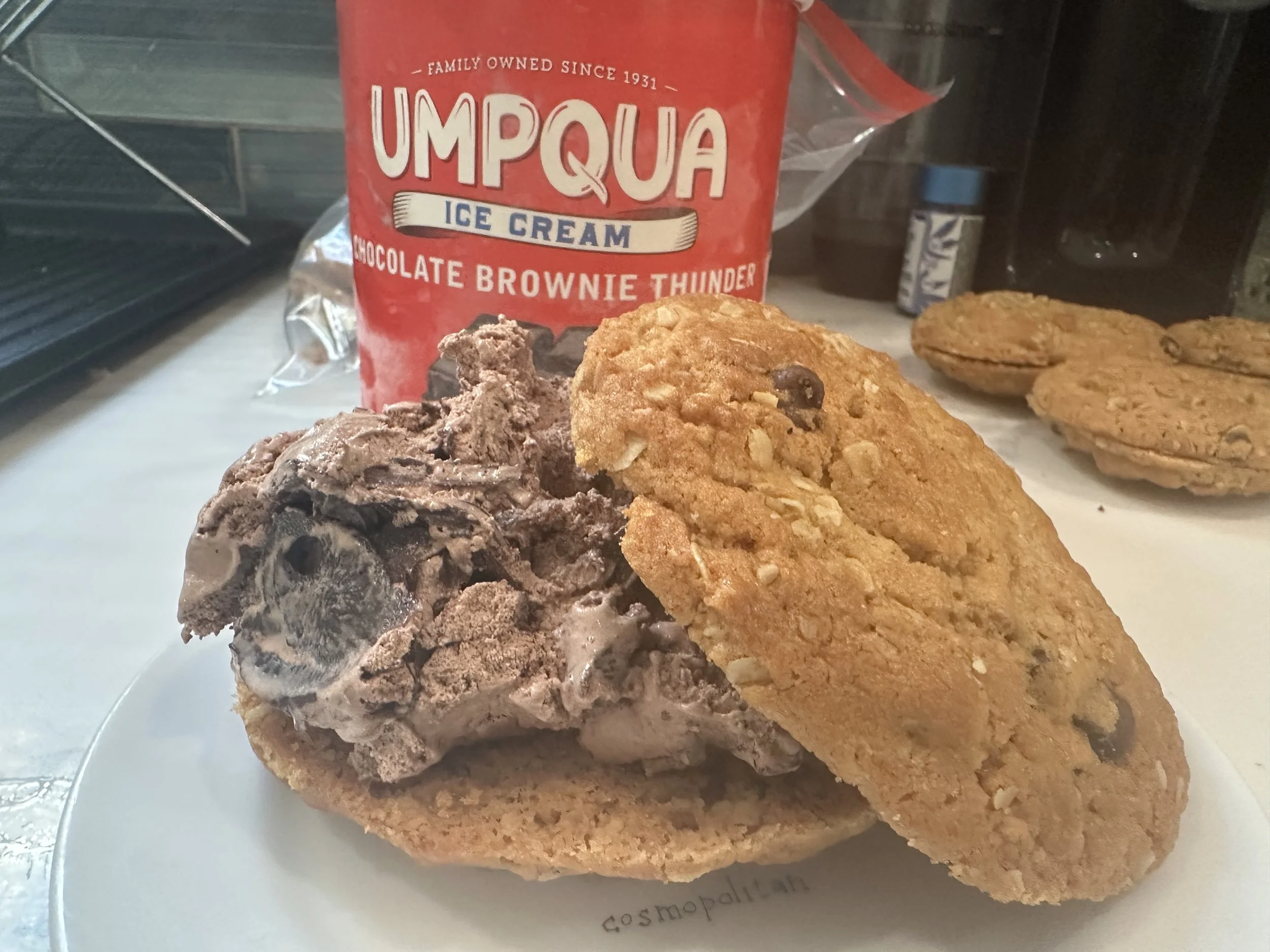 The Big Kahuna Crunchwich-Chocolate Peanut Butter Oatmeal Ice Cream Sandwiches Assembly! Chocolate peanut butter oatmeal cookie ice cream sandwiches made from leftover ingredients in a San Francisco kitchen. A nomadic baking story filled with cozy vibes, creative desserts, and heartfelt moments.