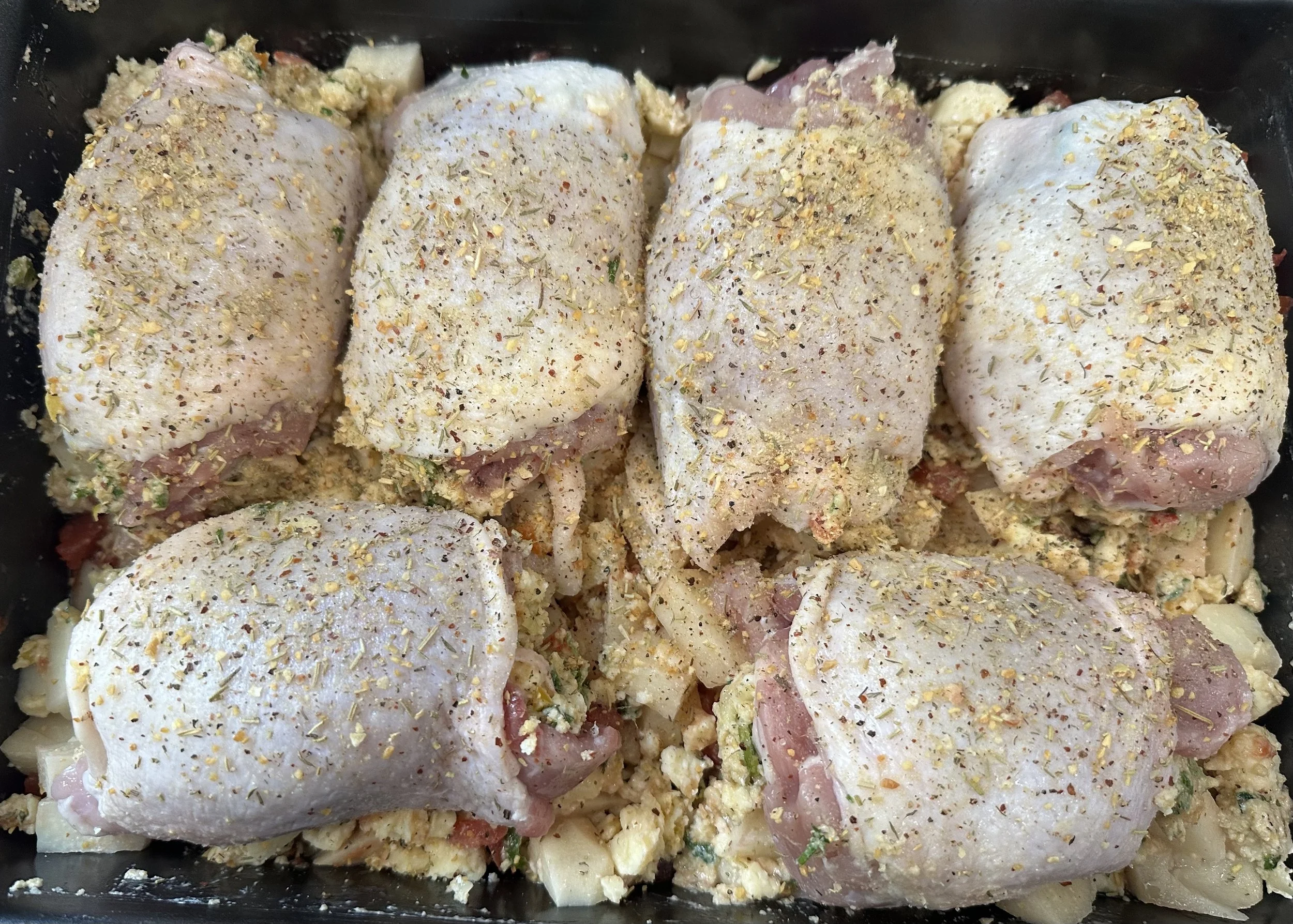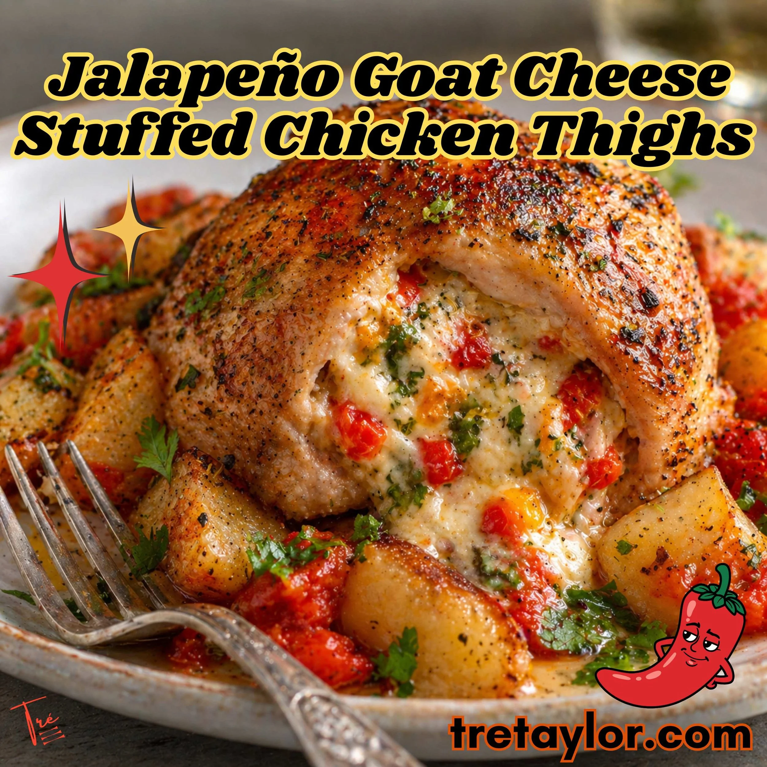🔥Jalapeño Goat Cheese Stuffed Chicken Thighs with Roasted Potatoes & Tomatoes