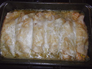 In the middle of each tortilla place equal amounts of cheese, crab, and shrimp. Set aside some cheese to sprinkle on top of the tortillas. Roll the tortillas to form enchiladas. Arrange side by side in a 9x13 inch baking pan.