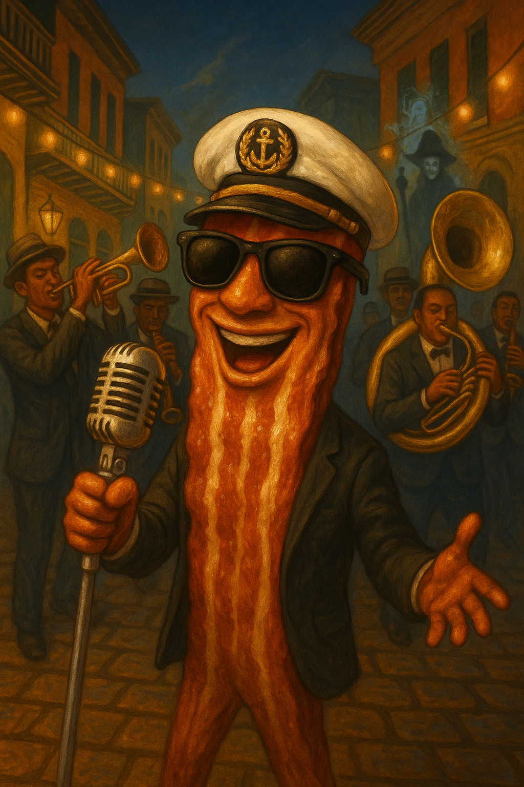 Born in a haze of hickory smoke on Bourbon Street, Captain Crispy emerged from a cast-iron skillet with a saxophone in one hand and a slab of applewood bacon in the other. From that moment forward, he was destined to be more than just breakfast—he was bound for glory.